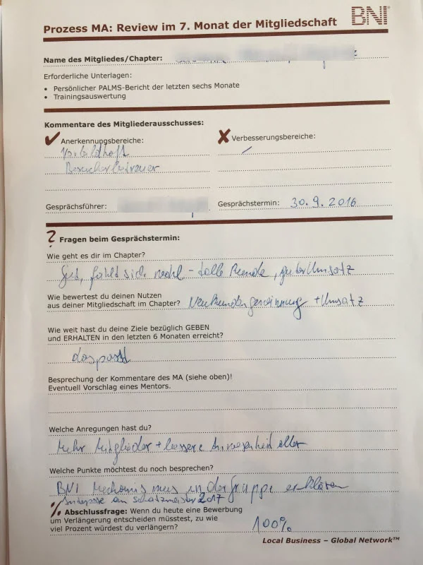 Hast Du alle Punkte gefunden? Oft sagen wir, das 7-Monats-Gespräch wäre dafür da, um herauszufinden, ob die Person verlängert. Tatsächlich erfahren wir oft viel mehr und viel Wertvolles über das Chapter. Denn jedes BNI Mitglied ist Unternehmer, von jedem können wir etwas wichtiges lernen.