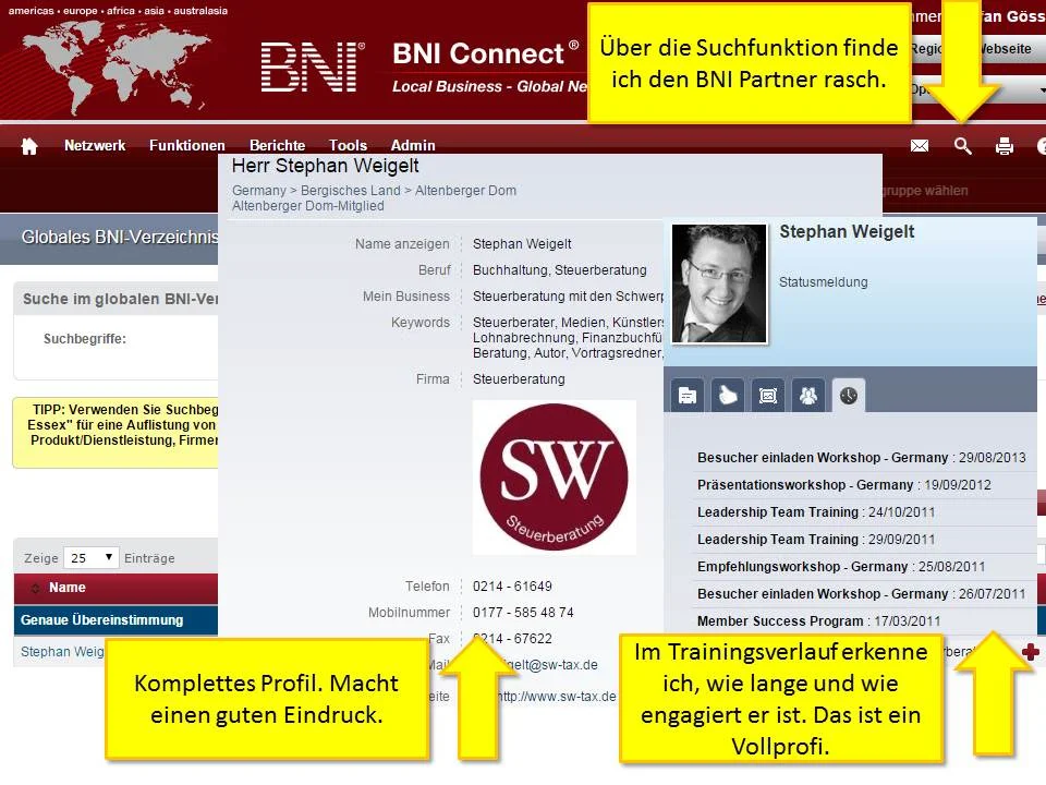 Der gesamte Prozess dauerte 13 Minuten, inklusive der Suche auf www.bni.de, BNI Connect und als Fleißaufgabe habe ich noch in Google Maps nachgesehen, wie weit die Büros der Steuerberater von seinem Wohnort entfernt sind (max. 20 Minuten). Der Aufwand war minimal, die vermittelte Chance ist das allemal wert.