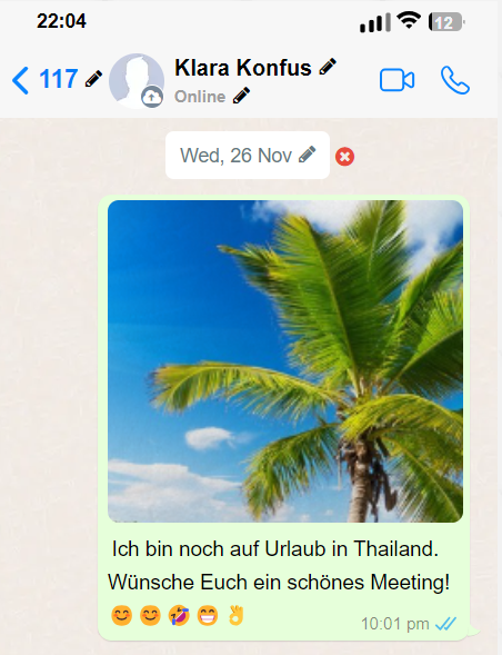 “Ich bin aktuell noch auf Urlaub in Thailand und wünsche Euch morgen ein schönes Meeting!”