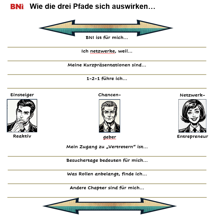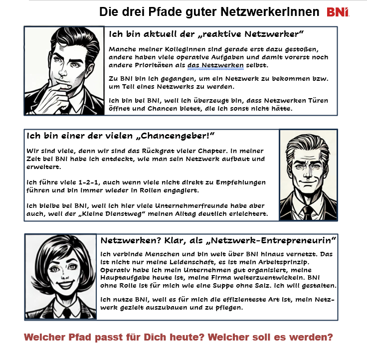 Der Anspruch an die BNI Mitgliedschaft reicht von “lass es nett bleiben” bis zu “machen wir es beim nächsten Mal etwas besser”.