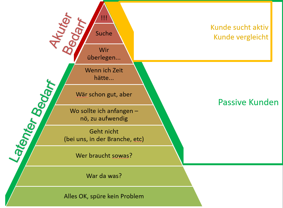 Erst ab einem bestimmten Grad der Dringlichkeit, wird ein Kunde aktiv. Es heißt “no pain, no change”, tut nix weh, ändert man nix. Wie viele von uns wussten seit Jahren, dass wir ein etwas besseres Netzwerk brauchen könnten? Wie viele begaben sich nie aktiv auf die Suche? Das ist der latente Bedarf, und den gilt es zu betreuen, denn von selbst werden Menschen mit latentem Bedarf nicht aktiv.