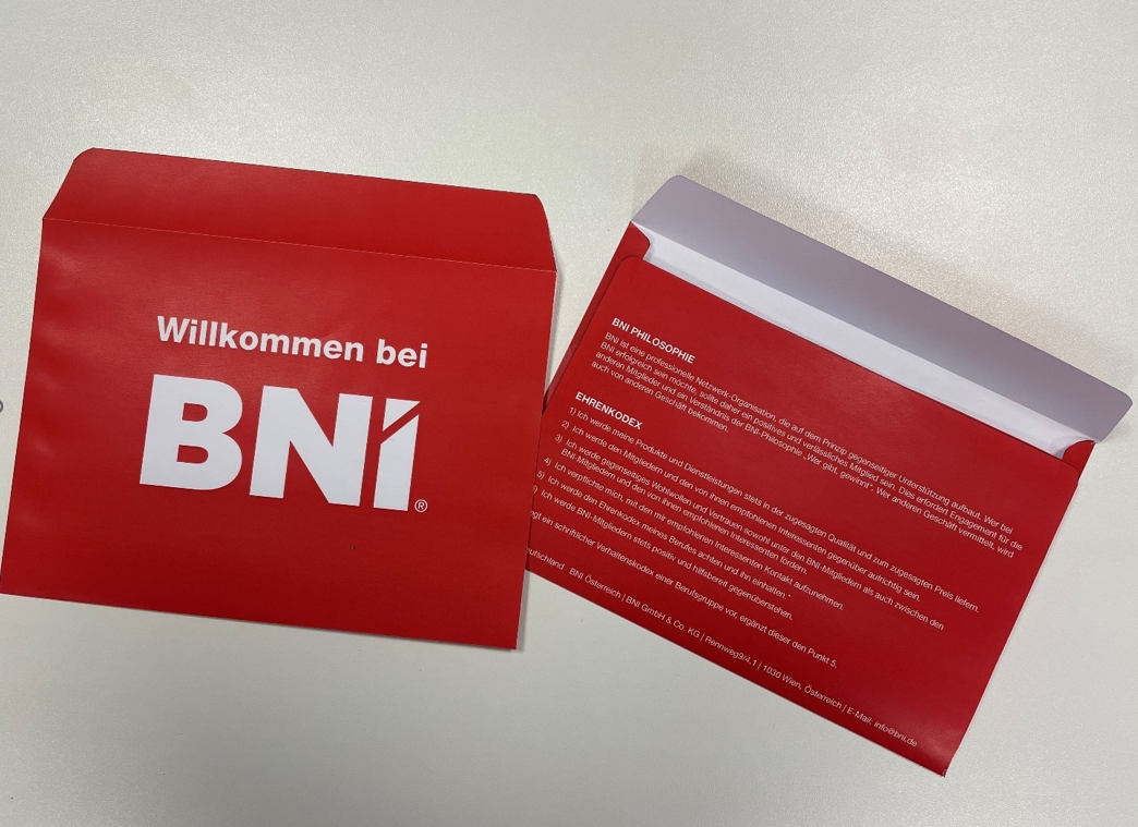 Die Aufnahme selbst erfolgt wie bisher, der BNI Ehrenkodex ist auf der Außenseite des Willkommensumschlags aufgedruckt. Der Willkommensumschlag wird offen verschickt, das Chapter kann zB einen aktuellen Ausdruck der digitalen Visitenkartenbox hinzufügen.