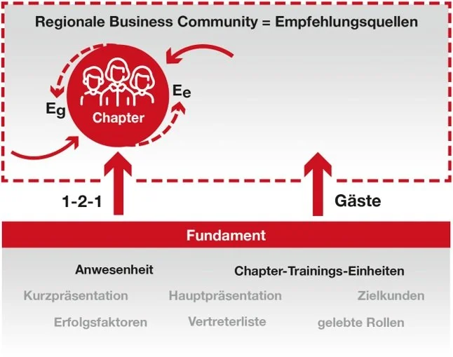Das Vier-Augen-Gespräch (“1-2-1”) ist die Basis und der Motor Deines Erfolgs im Chapter. Mit guten 1-2-1 treibst Du den “Empfehlungsmotor” an. Das ist im Bild der Empfehlungskreislauf von Eg & Ee (Empfehlungen gegeben und erhalten). Denn damit Du eine gute Chance auf gute Empfehlungen hast, müssen die anderen Dich kennen und Du musst die anderen kennen, um sie zu empfehlen und so den “Empfehlungsmotor” am Laufen zu halten. Lies hier weitere Ideen und Anregungen zum Vier Augen Gespräch nach.