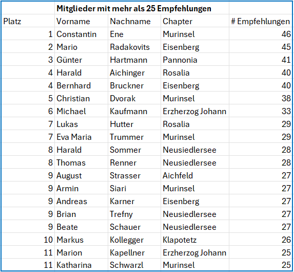 Auch auf Seite der Empfehlungen waren wir mit 3.061 Empfehlungen sehr stark unterwegs, das sind immerhin rund 10 Empfehlungen pro Person. Dabei hatten 34 Personen mehr als 1,5 Empfehlungen pro Treffen, was eine echte Leistung ist!