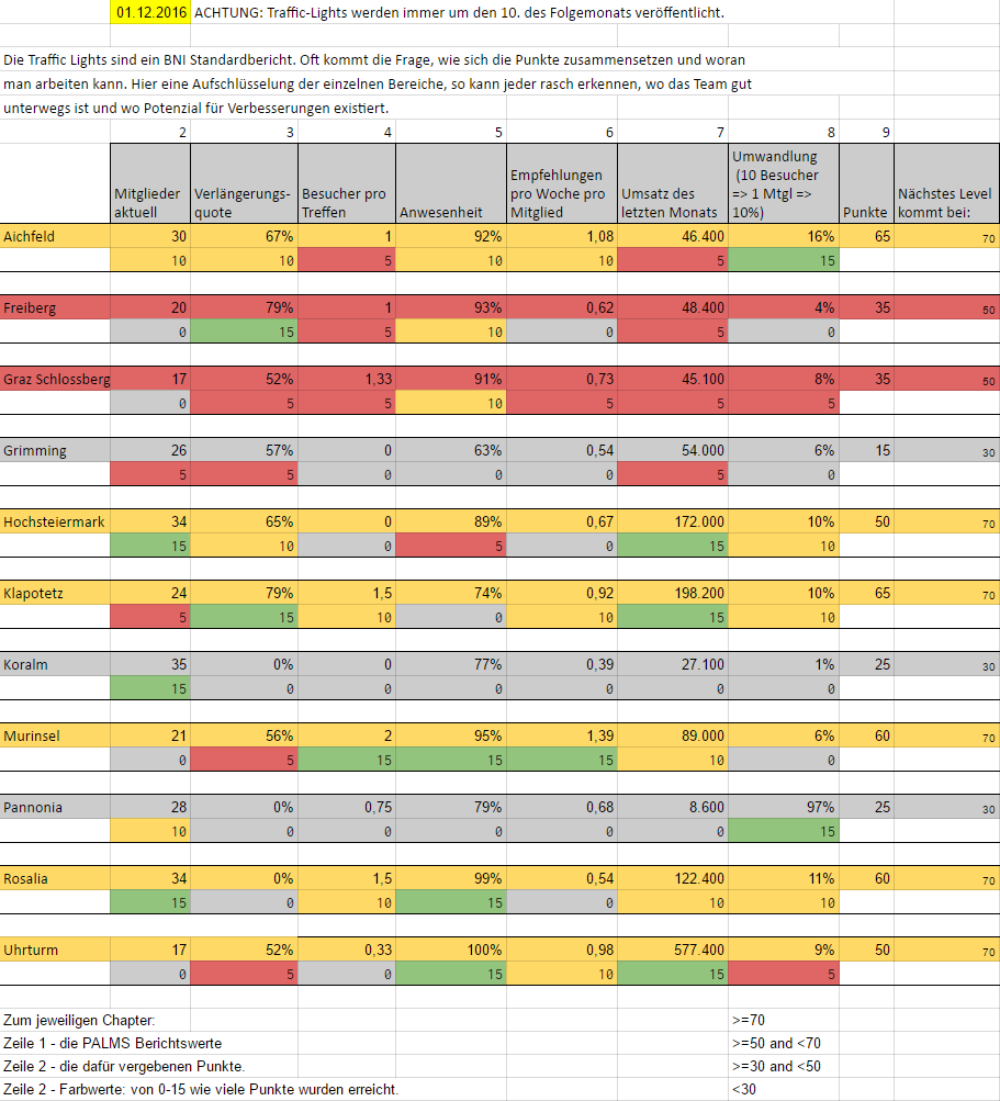 Dieser Bericht zeigt die Kerngrößen der Teams, wo wir stark sind (grün) und wo wir Schwächen haben (rot und grau). In der ersten Zeile siehst Du den Wert des Chapters und in der zweiten wie viele Punkte das Team dafür bekommt.