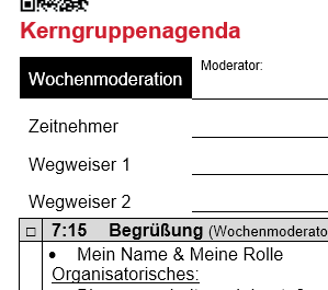 Ein Kerngruppenmeeting ist einfach moderiert und klappt gut, wenn es im Team abgewickelt wird. Damit Du Dich auf Deine Rolle vorbereiten kannst, hier ein paar Ideen über das hinaus, was in der Unterlage steht. Diese Seite wird ständig erweitert, es zahlt sich also aus, wiederholt nachzulesen.